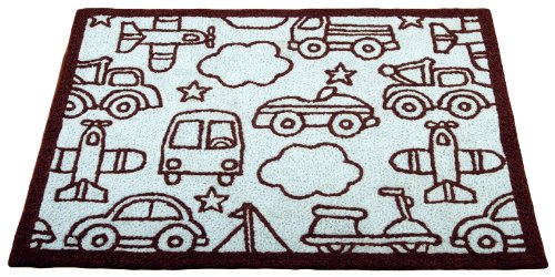 The Bon Voyage Nursery Area Rug features cars, sailboats, airplanes and clouds in brown detailing against a sky blue backdrop.